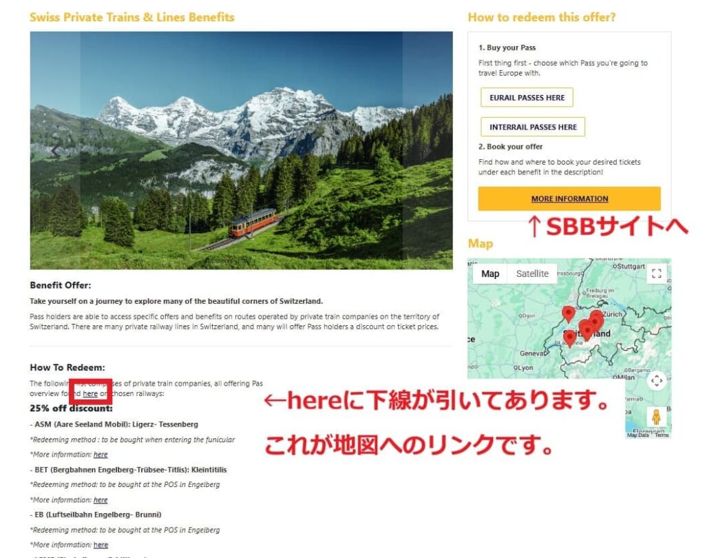 まりこさんの書かれていたEurail.comの正しい方の地図?「Swiss Private Trains & Lines Benefits」内の地図に辿り着けないのですが、