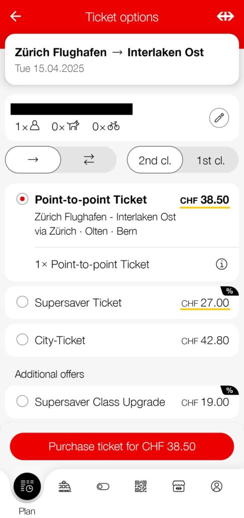 ハーフフェアカード利用のスーパーセーバーチケット27CHFしかし、詳細へ進むと、